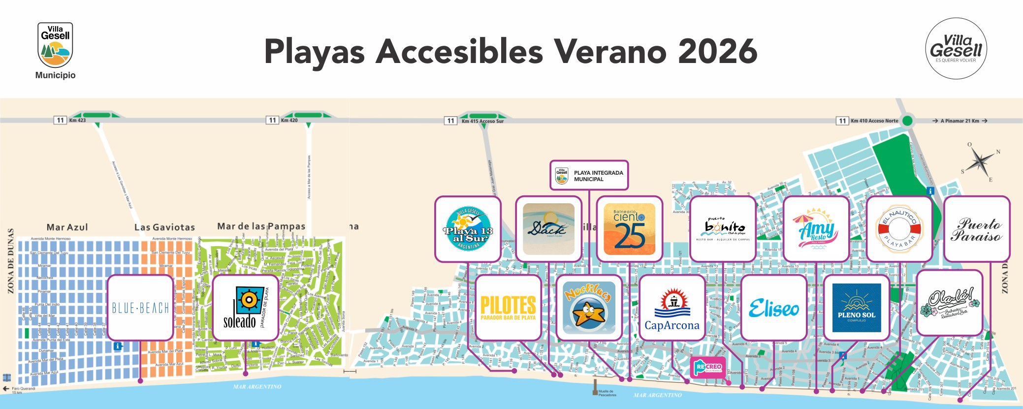 Información Adicional: Se recomienda consultar en cada parador sobre la disponibilidad horaria del servicio. Para conocer qué balnearios ofrecen Carta Braille, pictogramas o cuentan con desfibrilador (DEA), los interesados pueden ingresar a: www.gesell.tur.ar/balnearios